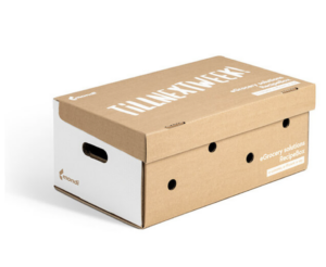 Click&LoadBox(© Mondi) – für Click & Collect von gemischten Lebensmittelbestellungen. Mit Griffen zum bequemen Verladen ins Auto und zum Tragen bis nach Hause.