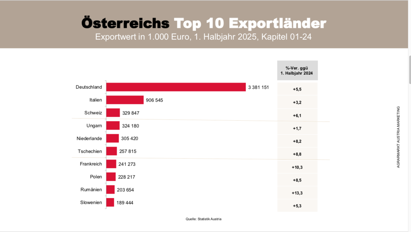 Österreichische Agrarexporte im 1. Halbjahr 2025: Deutschland bleibt zentraler Absatzmarkt