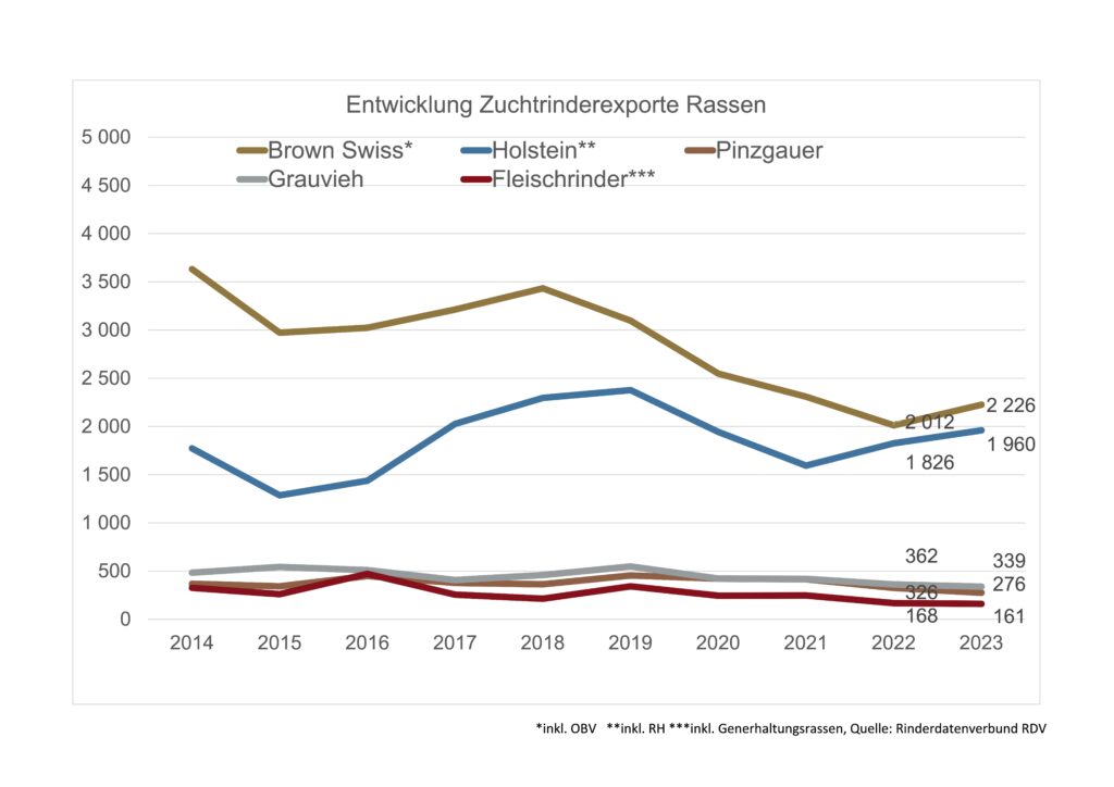 Die Nachfrage nach trächtigen Zuchtkalbinnen ist wie schon im letzten Jahr sehr hoch, sowohl auf dem Inlandsmarkt als auch für den Export. Die Durchschnittspreise für trächtige Zuchtkalbinnen lagen 2023 je nach Rasse und österreichweit zwischen 1.751,- und 2.469,-. Aus allen verkauften Tieren ergab sich ein Durchschnittspreis von 2.329,-. Die Durchschnittspreise auf den Zuchtrinderversteigerungen sind gegenüber dem Vorjahr um 300,- oder um 14,8 % gestiegen (alle Angaben netto und ohne Zuchtkälber weiblich). Aktuell werden auf den Versteigerungen – je nach Verband – sehr gute Preise erzielt. Vor allem wenn die Kalbinnen für den türkischen Markt bestimmt sind, wurden teilweise Preise um bzw. über 3.000,- erzielt.