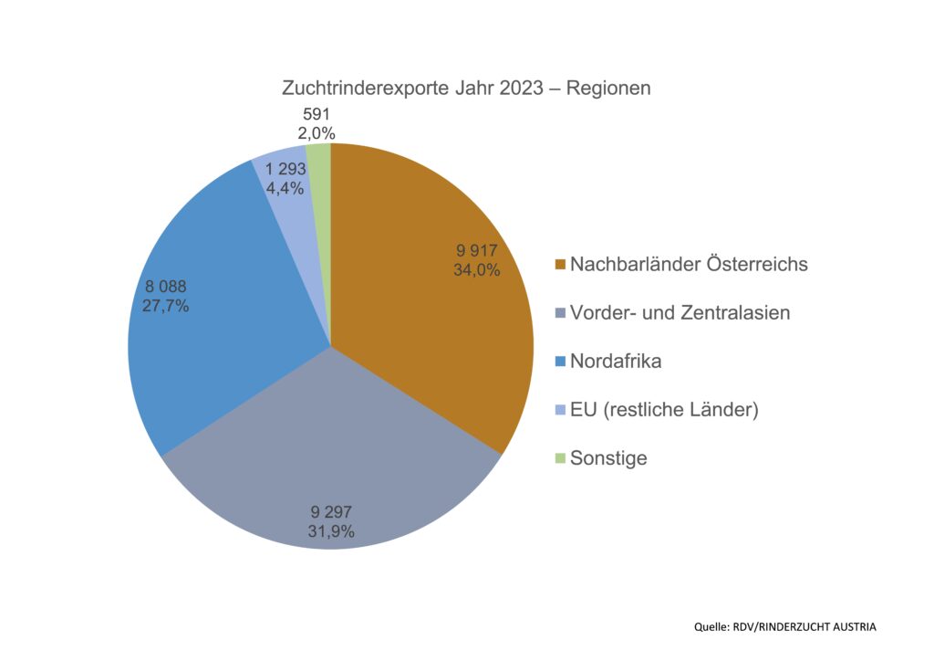 Das Jahr 2023 ist für die heimischen Rinderzüchter:innen aus vermarktungstechnischer Sicht sehr gut verlaufen. Zufriedenstellende Vermarktungspreise, auch aufgrund einer starken Nachfrage nach österreichischen Zuchtrindern, haben die Preise zusätzlich stabilisiert. Aufgrund des starken Interesses wurden im Jahr 2023 29.186 Zuchtrinder exportiert, um 5.300 Stk. oder 22 % mehr als im Vorjahr. Davon wurden 38 % oder 11.220 Tiere innerhalb der Europäischen Union vermarktet, die restlichen 62 % in Drittländer. Italien ist auch im Jahr 2023 das abnehmerstärkste Nachbarland österreichischer Zuchtrinder und ist seit vielen Jahren ein stabiler Abnehmer. Dorthin wurden 6.200 Tiere geliefert. Insgesamt wurden in die österreichischen Nachbarländer 9.917 Tiere geliefert, das sind 34 % aller Rinder. In den vorder- und zentralasiatischen Raum gingen 32 % aller Tiere bzw. 9.300 Stk. Der nordafrikanische Raum wurde mit 8.100 Tieren beliefert, das sind 28 % aller exportierten Tiere.