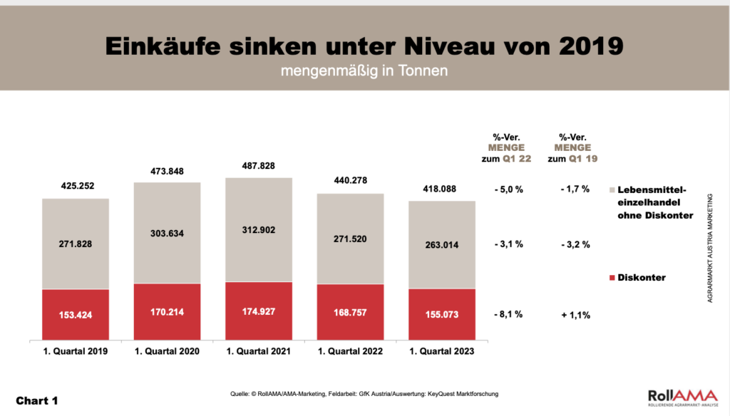 Insgesamt ging die Einkaufsmenge im ersten Quartal 2023 im Vergleich zum Vorjahr um fünf Prozent – und verglichen mit 2019 um zwei Prozent – zurück (Chart 1).