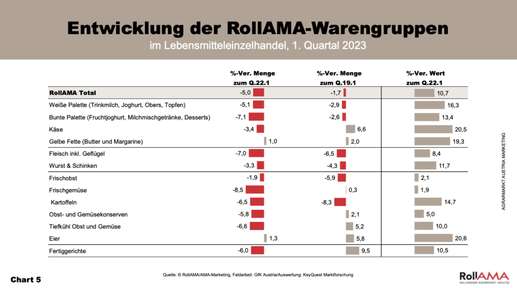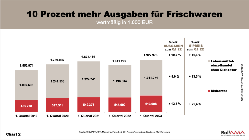 Die Ausgaben stiegen hingegen um 11 Prozent zur Vorjahresperiode, da der Durchschnittspreis eines „RollAMA-Einkaufskorbs“ um fast 17 Prozent höher ausfiel (Chart 2).