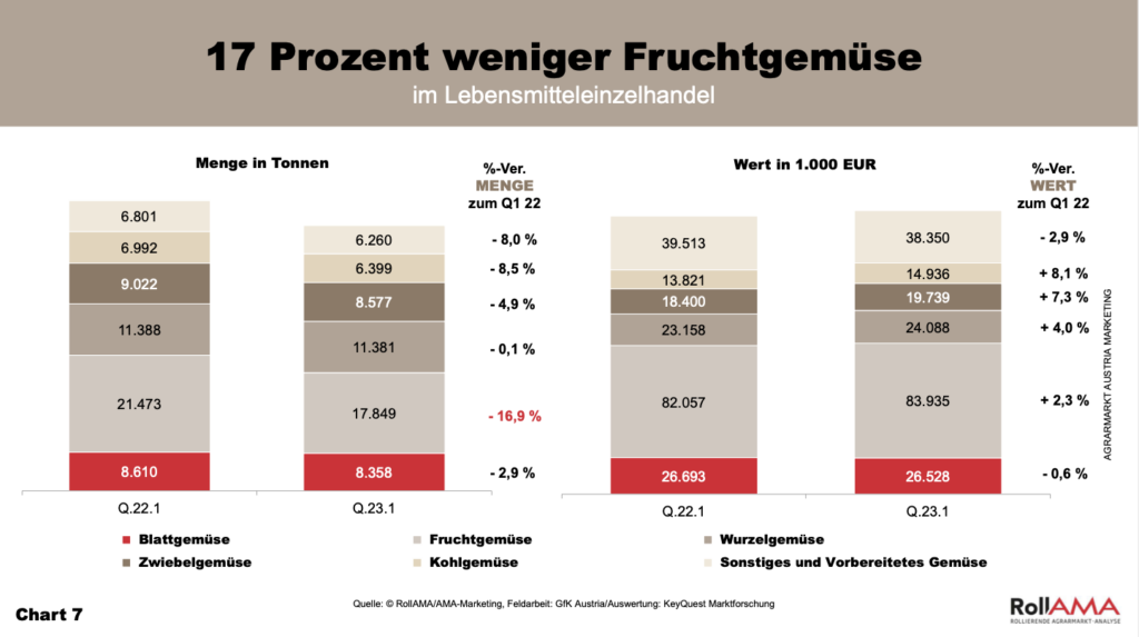 Die hohen Energiepreise ließen viele Glashäuser in ganz Europa während der Wintermonate kalt bleiben, die Produktion ging deutlich zurück und somit auch das Angebot von Fruchtgemüse im Supermarkt. Aus diesem Grund wurden im ersten Quartal um 17 Prozent weniger Tomaten, Paprika & Co. als im Vorjahr gekauft. Da diese Gemüseart in Österreich am beliebtesten ist, wirkte sich dies auch auf die Gesamtmenge des Gemüseeinkaufs aus, die um 8,5 Prozent sank (Chart 7).
