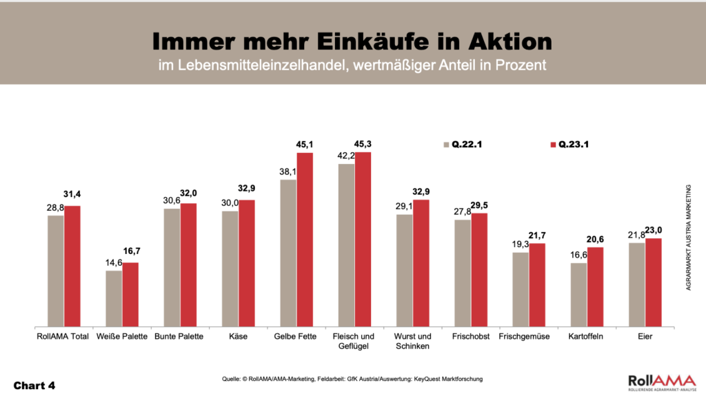 Dass Rabatte und Aktionen aktuell besonders beliebt sind, ist angesichts der allgemeinen Teuerung keine große Überraschung. In Aktion gekauft werden vor allem Gelbe Fette, etwa Butter sowie Fleisch und Geflügel. Fast die Hälfte aller Fleischeinkäufe landen mittlerweile rabattiert im Einkaufskorb (45,3 %).