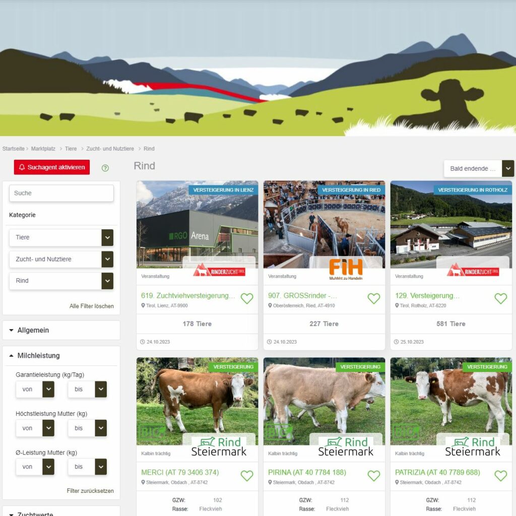 Das gesamte Rinderangebot ist direkt in der Rubrik „Rindervermarktung“ zu finden. Für die Suche nach dem passenden Tier stehen umfassende Suchkriterien wie z.B. die Auswahl nach Milchleistung, Zuchtwerten, physische Versteigerungen, Zuchtverbänden, BIO-Tieren, Regionen, nach Tierkategorien wie Kühe, trächtige Kalbinnen, Jungrinder, Stiere/Kälber oder die Anzahl an Kalbungen sowie den Hornstatus zur Verfügung. Wenn gerade kein passendes Angebot verfügbar ist, kann ganz einfach analog zu diversen Handelsplattformen ein „Suchagend“ aktiviert werden.