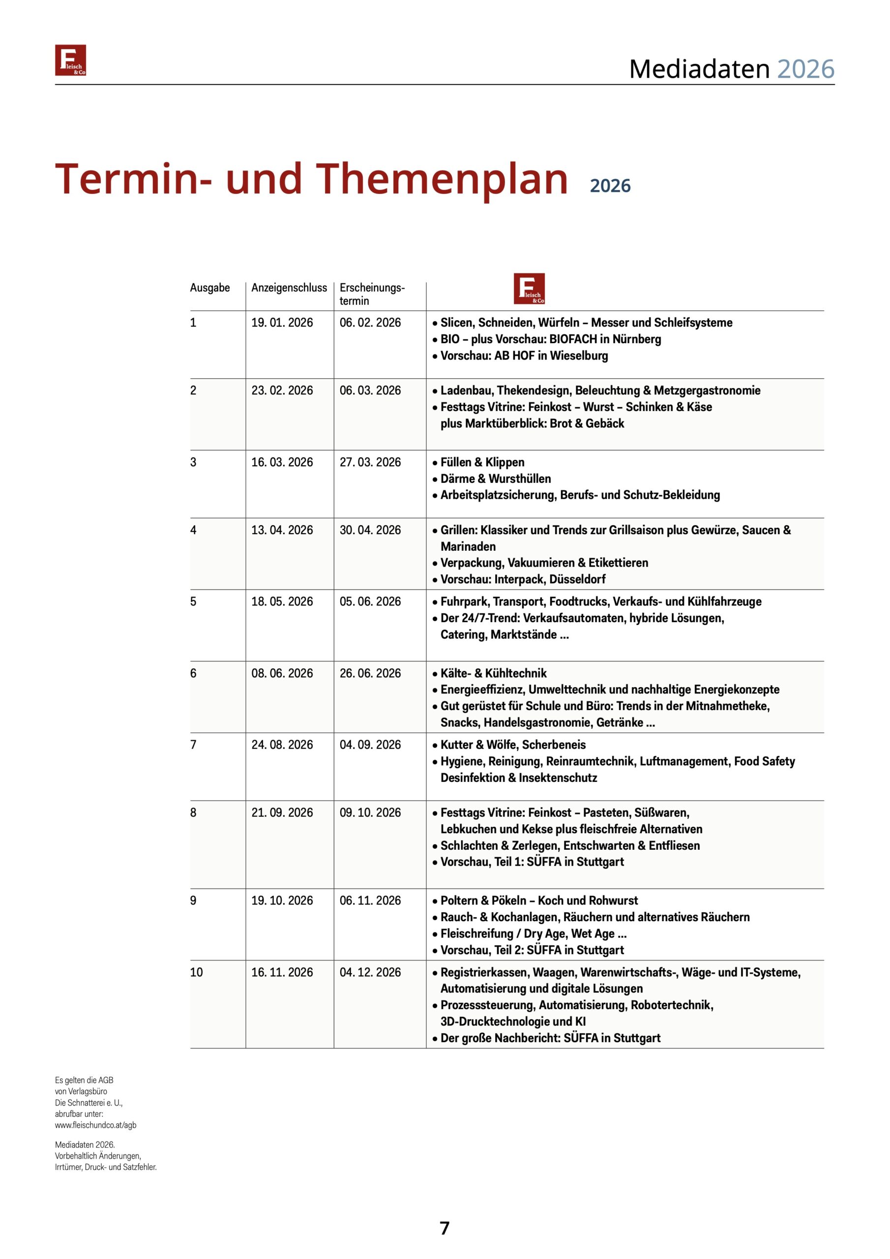 Trotz allgemeiner Kostensteigerungen in Produktion, Papier und Vertrieb haben wir uns entschieden, unsere Inseratenpreise auch 2026 unverändert zu lassen. Damit setzen wir ein klares Zeichen für Stabilität und Verlässlichkeit – und unterstützen unsere Partnerbetriebe sowie die gesamte Fleischbranche in wirtschaftlich herausfordernden Zeiten.